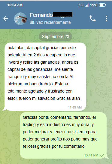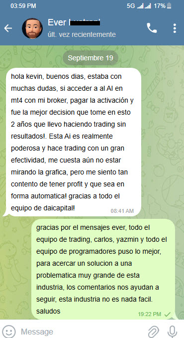 "Invertir en Forex es algo muy complejo y complicado hay mucha información, además sabemos que si no se tiene el conocimiento y la técnica correcta se puede perder toda la inversión, nos decidimos por daicapital.org por un amigo que nos mostro sus beneficios, y como con la AI ALGO AI PRO, comenzo a tener beneficios constantes. Gracias Daicapital este AI realmente sabe como ganarle al mercado y obtener beneficios!!!